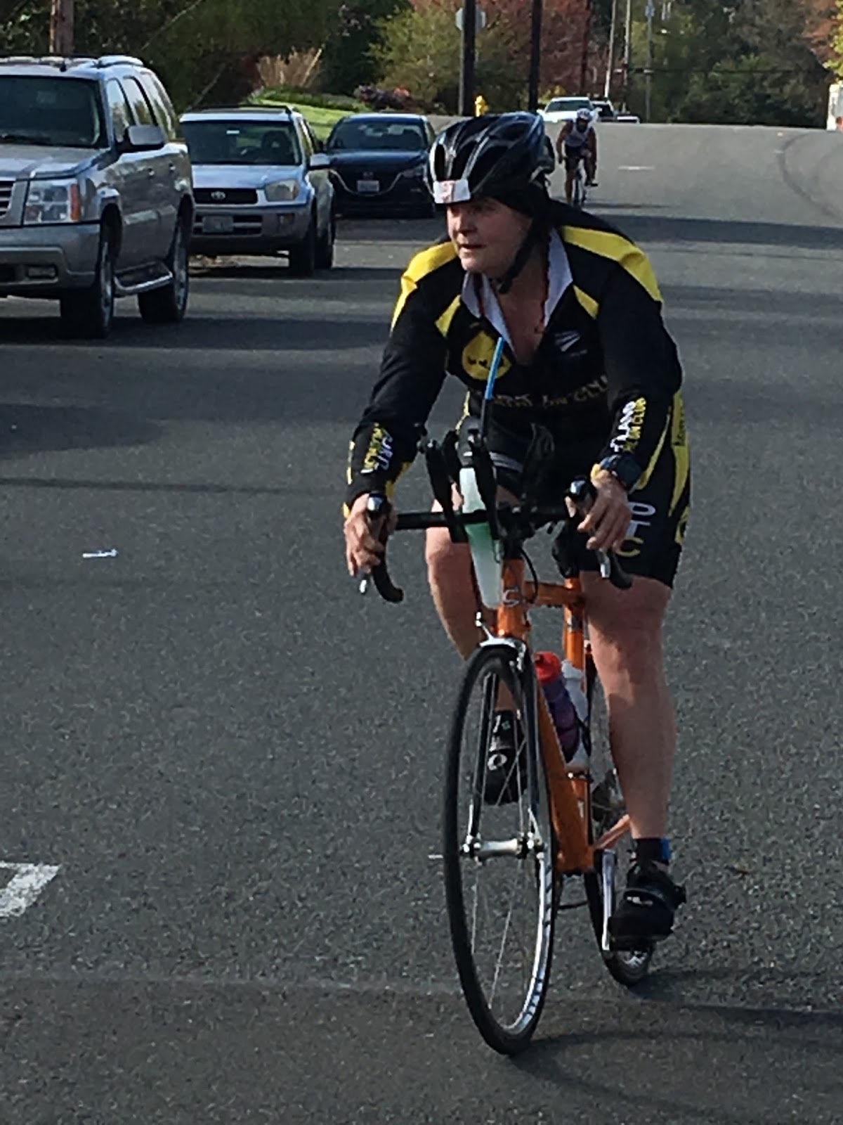 Being an early season tri and 39 degrees at the start, I had a lot of clothing options set up in transition. But, the sun was out and despite choosing loose things that I could try to put over my wet tri kit, I ended up forgoing most of them. I put on my winter cycling jacket, an under-helmet beanie to keep my wet head warm, but couldn’t get my winter cycling gloves or socks on, so I went sockless and gloveless! But in my exasperation in trying, I forgot to put on my racing glasses, but it turned out okay, thankfully (no bugs, no pollen).