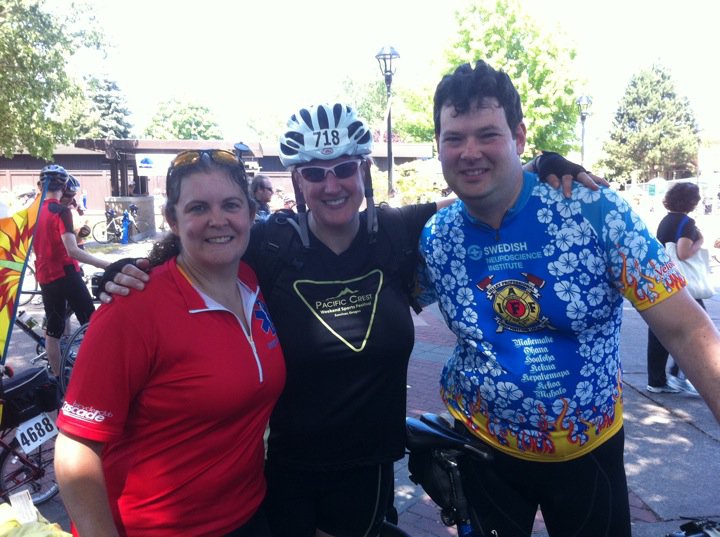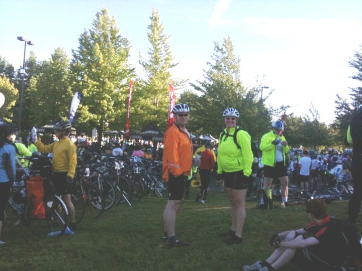 Theresa and I loaded our bikes on my car and headed up to Seattle the night before with Mother Superior. Thanks, Theresa, for the wonderful suggestion on staying in the Seattle area the night before rather than driving up at 2AM! We met Dan at 5AM at the start in the parking lot of the University of Washington. Mom then drove my car back home to my house. Thanks, Mother Superior! We couldn’t have done it without you and all your driving!!!