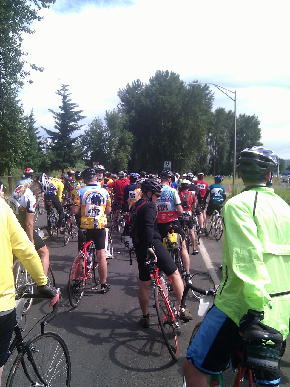 We couldn’t have asked for more perfect weather. There were broken clouds, cool but not cold, at our 6AM start. They started us off in waves as riders accumulated at the starting line. The route took us past Lake Washington, to the first major stop at the Kent REI. This was the best stop of the whole event, with 70s disco music, a costumed emcee at the entrance, girls carrying trays of food for the riders, etc. We were energized…I danced the whole time we were there!