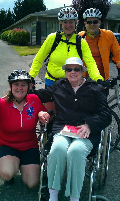 Mother Superior noticed prior to the ride that the route was going to pass right in front of the Canterbury Inn where Grandma Janet lives. So we gave a heads-up text to Mom when we left Lexington and stopped to visit Mom Sup and Grandma four miles later. It was so great to stop and visit Grandma and be greeted with cold washcloths for our faces and fresh fruit from Mom! Mom and Grandma had been sitting out front for an hour enjoying watching all the riders pass…they were cheering and clapping for them and the riders waved and hollered back and rang their bicycle bells as they went past.