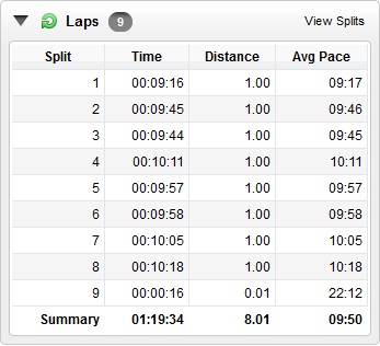 Normally I wouldn’t blog about a single training run, but I posted a little teaser on Facebook about putting a running tip into action that improved my running pace. At the Mock Tri, the person leading the running clinic mentioned a little trick to improve your pace….wait for it…I felt so silly for not knowing this…swing your arms faster and your body will follow!! So I did it, and, it worked! My running pace on long runs usually falls to about 10:30 and the pace for my 8 mile run at Lacamas was 9:50, my fastest pace for that distance. In fact, my first mile pace, where I was really working on moving my arms faster, was 9:17, my fastest pace ever. I’m posting my splits from my Forerunner. I was, and still am, so excited!
