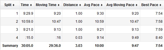 Turns out I had a very inconsistently paced run, anywhere from 7:54 to 9:30 mile (the 10:59 is part of a walk). I was confused by this at first, and then I realized that my Garmin was not showing me real time pace during my run, rather an average, allowing huge swings in my tempo. No wonder I was exhausted. Grrr! So I changed the settings on my device and had another 30 minute run a couple of days later: