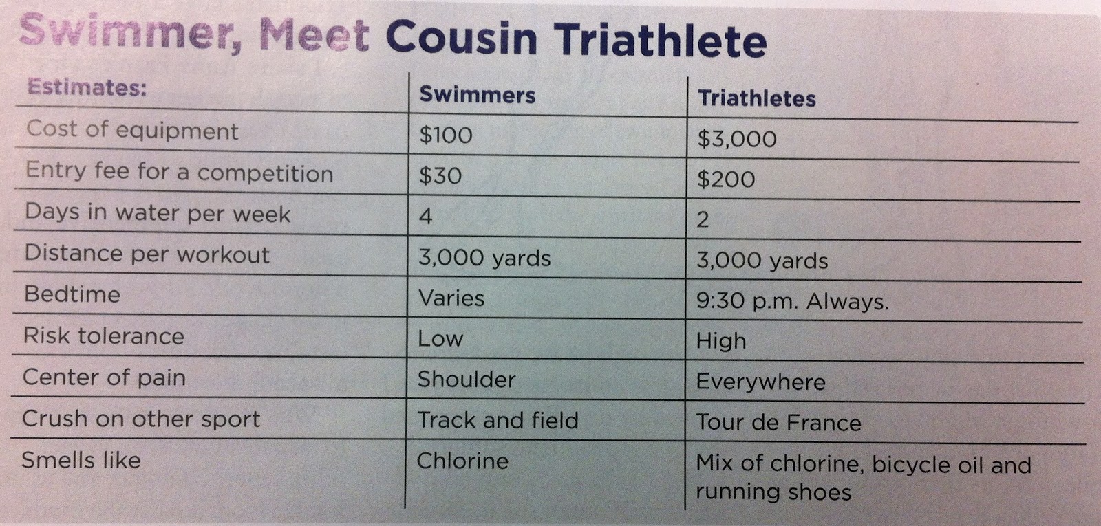 I did love two things from the article, the table showing the differences between swimmers and triathletes: