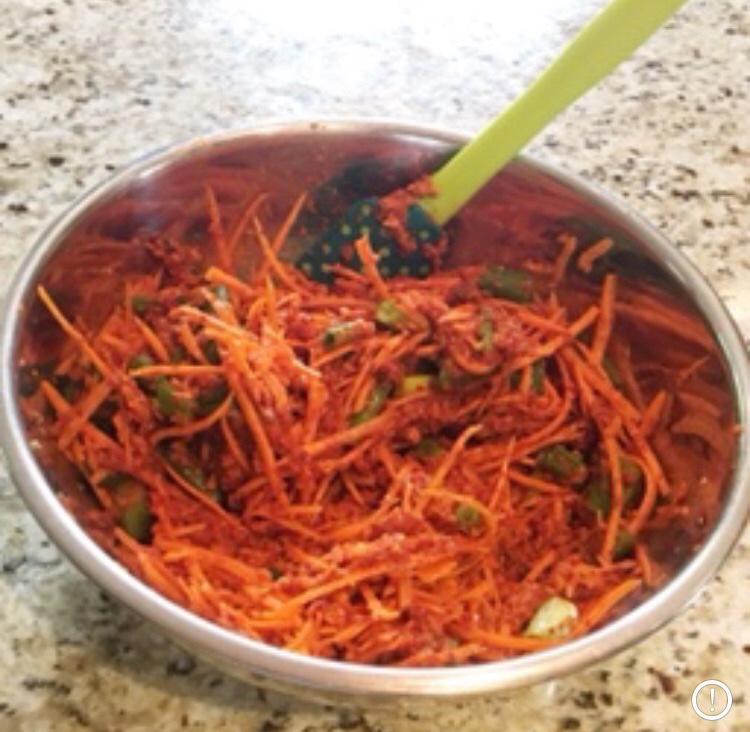 Here are the veggies all mixed up with the chili mix, so gorgeous! We chopped the bok choy and chard in to bite-sized pieces because none of us are fans of pulling giant pieces of kimchi out of jars and splattering the sauce everywhere in the process!